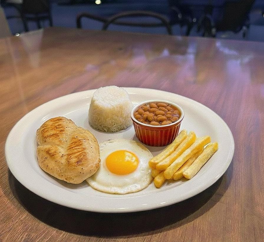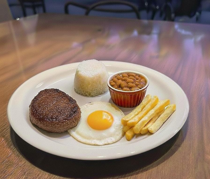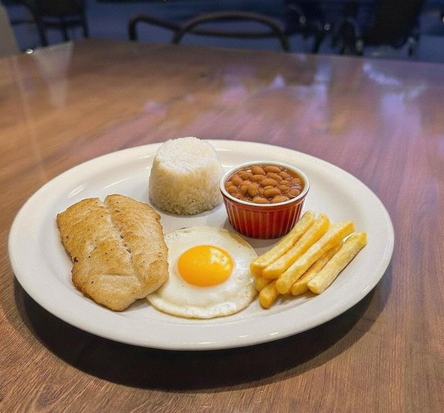 PORÇÃO REDUZIDA PROTEÍNA DE SUA ESCOLHA ( BIFE DE COXÃO DE DENTRO , FRANGO OU PEIXE ) , ARROZ BRANCO , FEIJÃO , OVO FRITO E BATATAS FRITAS.