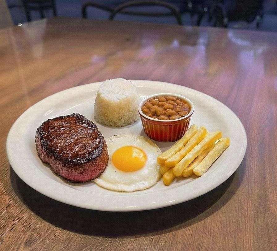 PORÇÃO REDUZIDA DE FILÉ MIGNON , ARROZ BRANCO , FEIJÃO , OVO FRITO E BATATAS FRITAS.