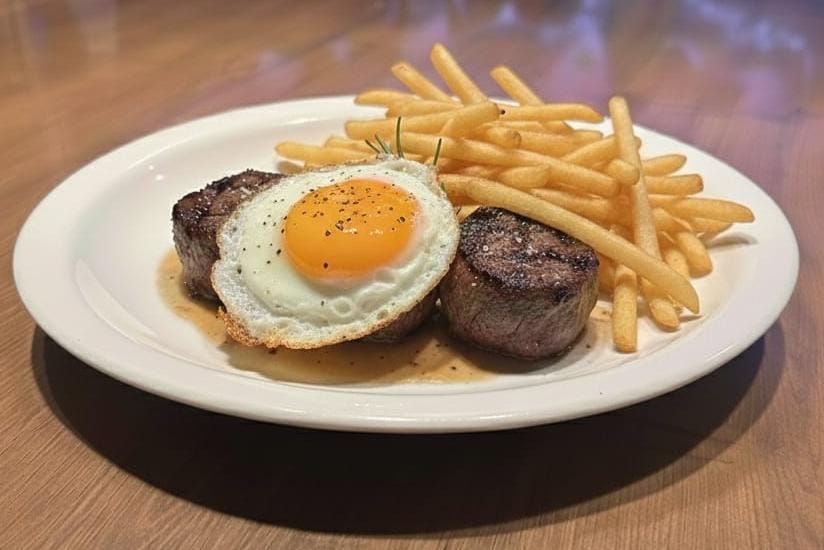 FILÉ MIGNON GRELHADO, OVO FRITO E BATATAS FRITAS .