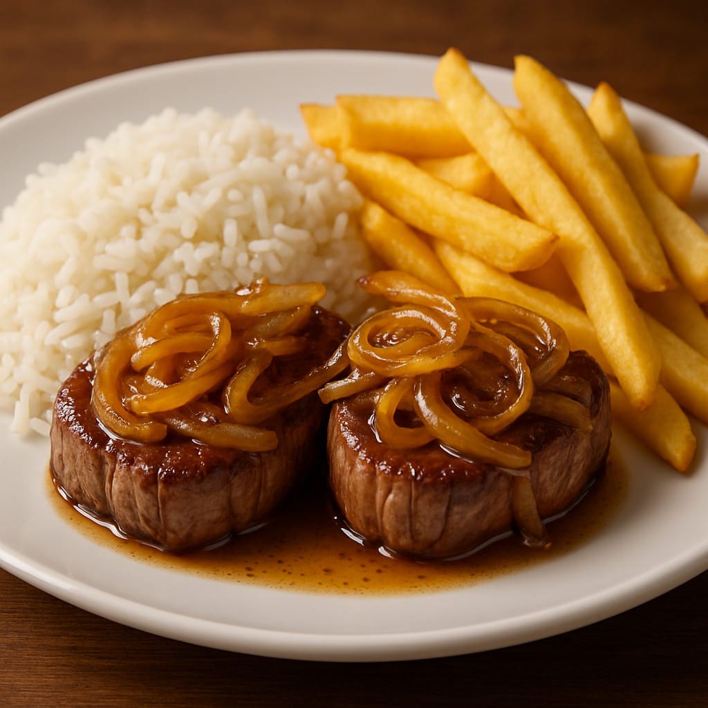 SUCULENTO FILÉ GRELHADO COM GENEROSA PORÇÃO DE CEBOLAS SALTEADAS, ACOMPANHADO DE ARROZ BRANCO E BATATAS FRITAS CROCANTES.