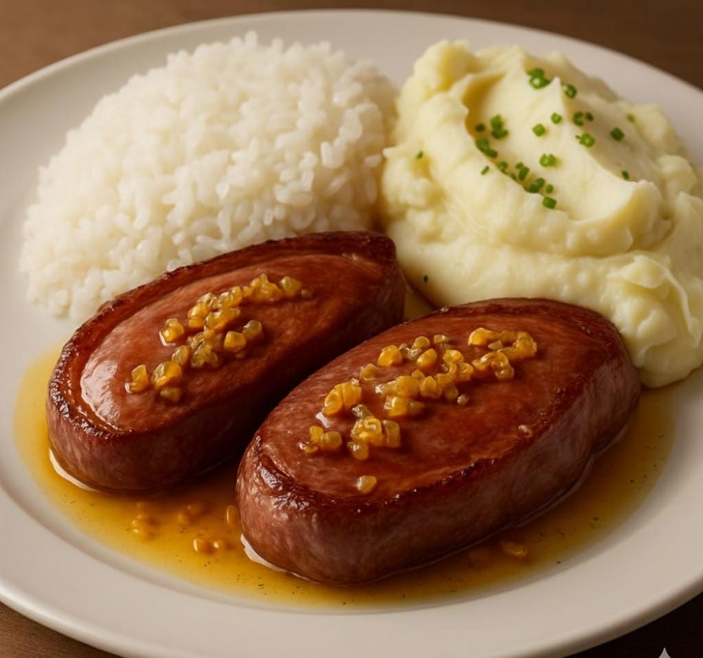 PICANHA GRELHADA AO ALHO E ÓLEO , ACOMPANHA ARROZ BRANCO E PURÊ DE BATATAS.