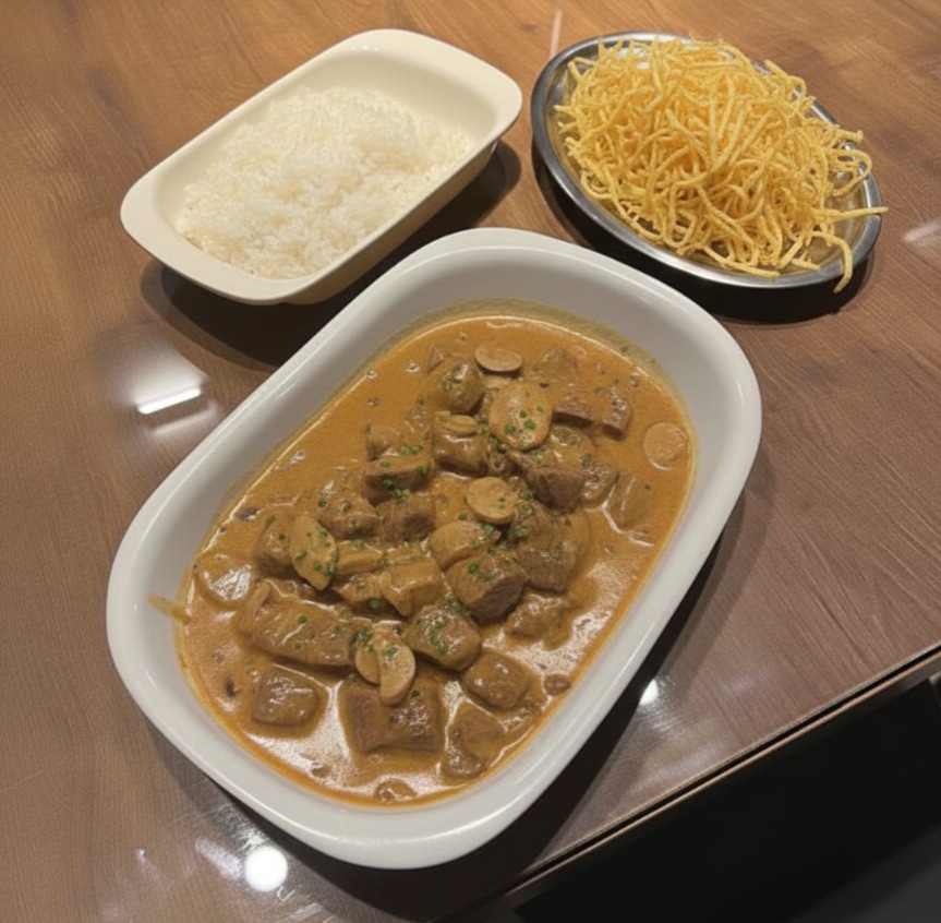 TIRAS DE FILÉ MIGNON GRELHADAS E SALTEADAS COM CHAMPIGNON E FINALIZADAS COM CREME DE LEITE . ACOMPANHA ARROZ BRANCO E BATATA PALHA.