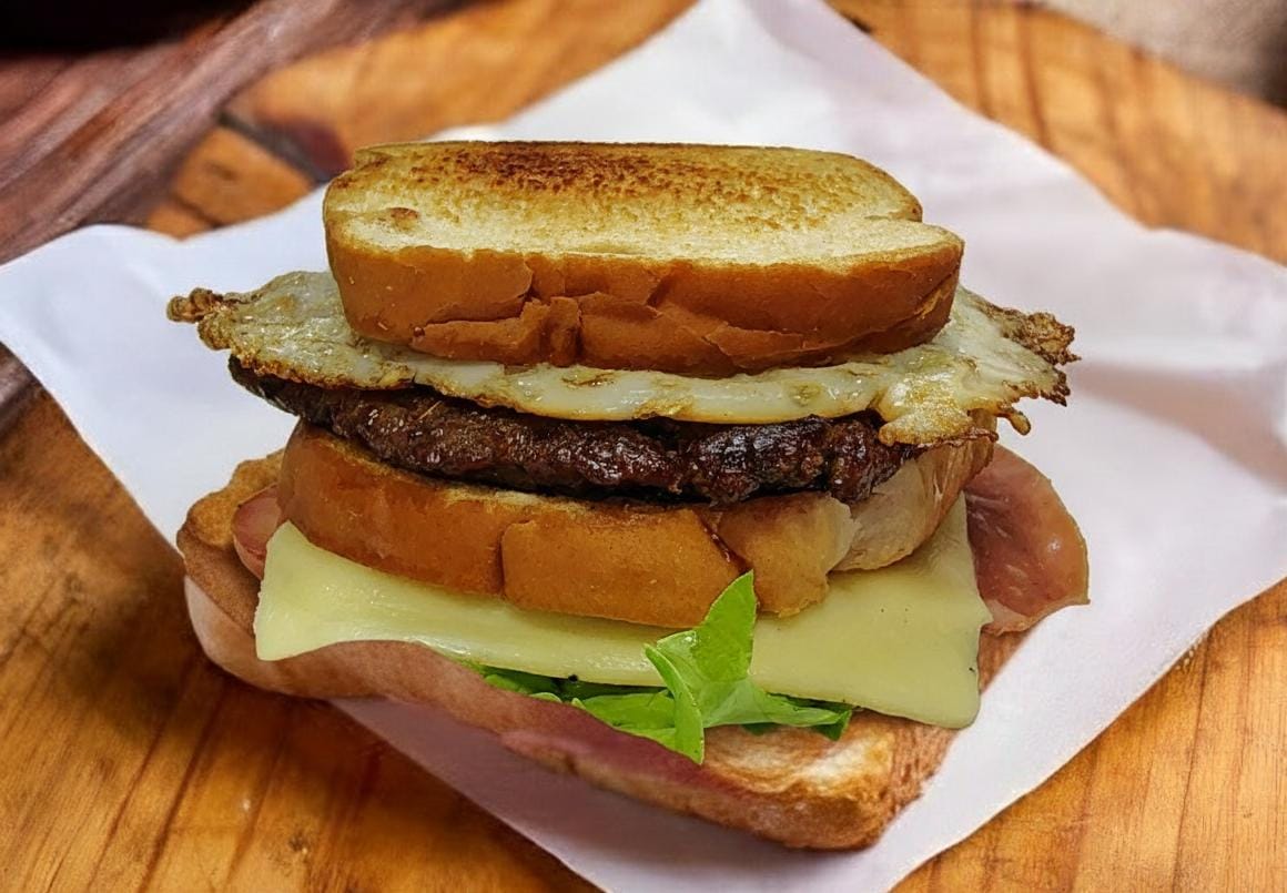 TRÊS FATIAS DE PÃO DE FORMA, MAIONESE, BIFE DE HAMBÚRGUER, PRESUNTO, QUEIJO, OVO, ALFACE E TOMATE.